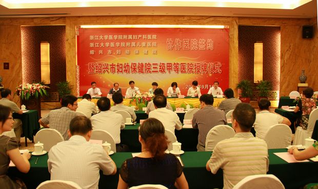 9月16日下午,我院在国际大酒店隆重举行医院与浙江大学医学院附属妇产科医院、浙江大学医学院附属儿童医院协作医院签约暨三级甲等医院授牌仪式。绍兴市副市长丁晓燕、市政府副秘书长邵田田、省卫生厅妇社处处长胡崇高、浙大附属妇产科医院院长黄荷凤、浙大附属儿童医院副书记俞惠民、市卫生局局长马国灿等领导出席仪式。