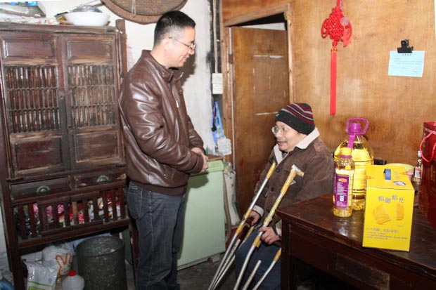 1525为发扬中华民族尊老、敬老的光荣传统,1月28日上午,我院党办联合团委开展了帮困送温暖活动。团委书记赵军等党团员志工一行5人在八字桥社区茹主任等的陪同下,向该社区的5个孤寡老人、困难户家庭送上食用油、水果等慰问品,祝福他们过一个祥和喜庆的春节。