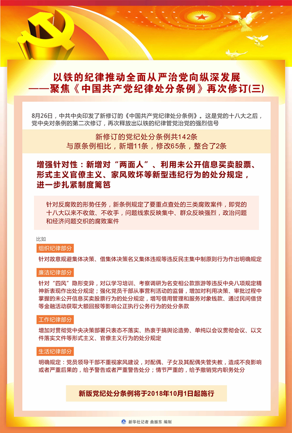 新版党纪处分条例将于2018年10月1日起施行。它的颁布施行必将不断提高纪律建设的政治性、时代性、针对性,以更加科学、更加严密、更加有效的思路举措,推动全面从严治党取得更大战略性成果。