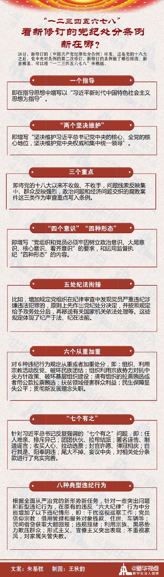 26日,中共中央印发了新修订的《中国共产党纪律处分条例》。这是党的十八大之后,党中央对条例的第二次修订,再次释放出以铁的纪律管党治党的强烈信号。