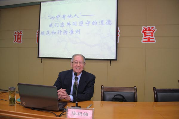 陈教授以胡锦涛总书记的讲话“一个社会是否和谐,一个国家能否实现长治久安,很大程度取决于全体社会成员的思想道德素质”入题,道出提高社会成员的思想道德素质的关键在于让社会成员人人都“心有他人”。他引经据典,从孔子的“夫子之道在于忠恕,己所不欲,勿施于人”、孟子的“无恻隐之心,非人也”,大家季羡林对“什么是好人”的标准:“考虑人家比考虑自己多一点的人,就是好人”等等,讲述“心有他人”,即同情人、关爱人、帮助人,是协调人与人之间的关系的根本原则,是道德的基础与标准,也正是构建和谐社会的道德基础与标准。正如 “人”字象征着互相支撑,人是应该互相关心、互相帮助的。同时,“心有他人”作为道德建设的关键,可分为三个层次:如果做不到关爱人、帮助人,但如能尊重人、理解人也很不错,再退一步是至少不要去打扰人、妨碍人、给人添麻烦。低层次的“心有他人”也做不到,肯定会违纪犯规。低层次的“心有他人”是对所有人的普遍要求,如果人人能做到,社会不和谐因素就会大大减少。作为医务人员,“心有他人”是设身处地,推己及人,要更积极主动地去关爱患者,毫不犹豫地去帮助患者减轻病痛,促进身心健康。