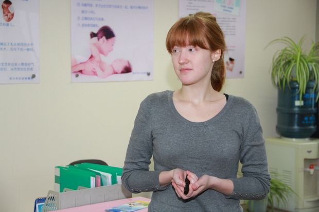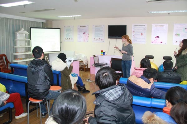 在产科门诊很多来院检查的孕妇们到孕妇学校听了一堂洋文版的孕妇保健小班课。洋护士Miia为孕妇们讲解孕期营养与孕期锻炼,指出了孕妇在不同孕期所必需的营养物质,并要求遵循安全、科学、健康的三大饮食原则,以及孕期营养不良或营养过剩对母婴健康的影响;同时建议孕妇要加强孕期锻炼,适当地做一些散步、慢跑、游泳、跳舞、健身房等有氧运动,有助于改善身体和精神状态,保障孕妇的血液循环和呼吸顺畅,从而给胎儿创造更好地氧供条件;孕期锻炼要以安全为原则,应避开运动量大、持续时间长或在过热和潮湿天气环境下的锻炼和身体活动。