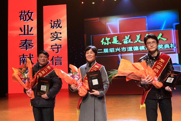 第二届绍兴市道德模范设“助人为乐模范”、“见义勇为模范”、“诚实守信模范”、“敬业奉献模范”和“孝老爱亲模范”等奖项,我院张秀兰主任等10位道德模范获奖者及8位道德模范提名奖上台领奖。