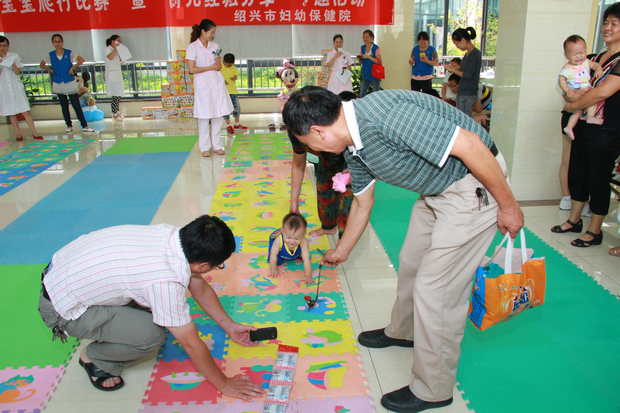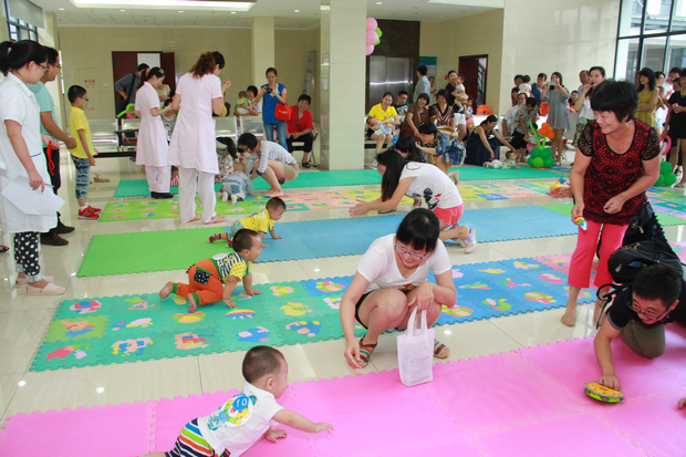 9月15日上午,我院妇幼保健中心大厅内很热闹,36名7-9月龄的宝宝分三个组别在这里开始了人生的第一场角逐——“宝宝爬行比赛”。