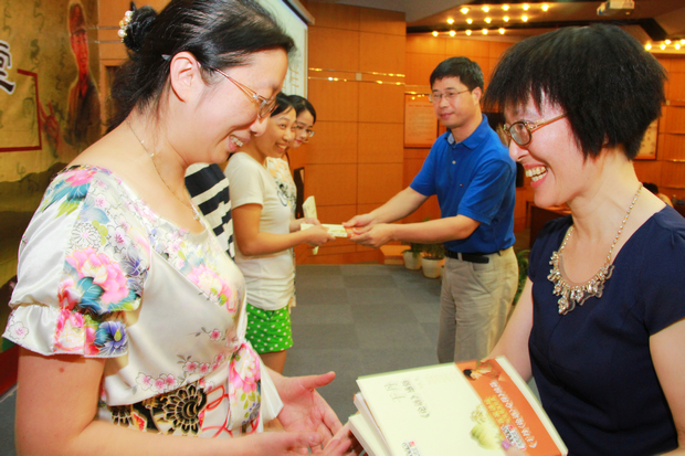 张建荣书记、宣讲人解左平还向我院省青年文明号获得科室分娩室、省巾帼文明岗获得科室功能检查科的职工代表“送吉祥”。会后,每位参会人员收到本期道德讲堂的一份“吉祥”礼物,一本本《焦裕禄》、《雷锋日记》、《论语》、《孟子》、《大学》、《中庸》等道德文明类经典好书。