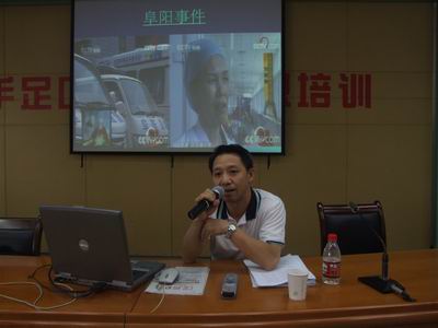 (我市赴安徽阜阳抗击手足口病的医疗队队长,也是我市手足口病防治专家组成员的我院儿科张霖副主任医师正在为我市广大医务人员作手足口病防治专题讲座)