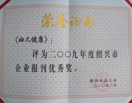 我院院报《妇儿健康》在市总工会组织的2009年度绍兴市优秀企业报刊评选中脱颖而出,喜获优秀奖。