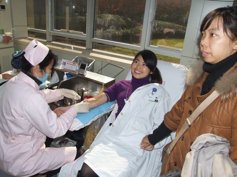 近日我市临床用血量较大,血液库存告急,我院医务人员积极响应市卫生局、市中心血站的号召,纷纷到东街献血屋献血。(图为我院青年职工庞小敏正在参加无偿献血)