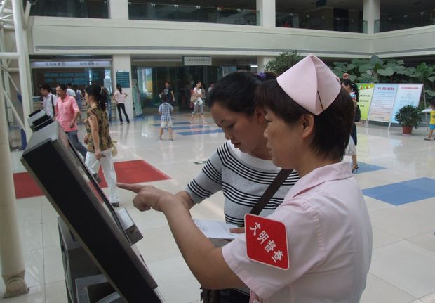 督查员在指导患者打印报告单,为患者提供便捷服务