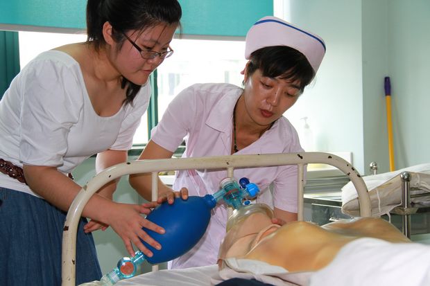 杨迪琼护士长在指导新职工进行心肺复苏及呼吸囊的使用技巧