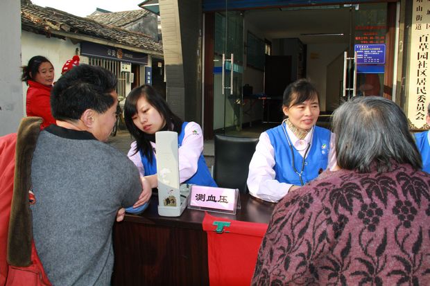 志工正为社区大妈们测量血压,传授冬季保健知识