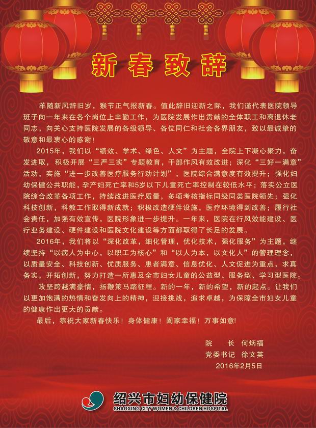 1911律回春晖渐,万象始更新。1月29日晚,我院举行2015年度总结表彰大会暨迎新晚会。医院领导班子、各科室干部职工及先进代表共计400余人齐聚一堂,回顾总结2015年取得的成绩,共同展望2016年的美好前景。会上,何炳福院长作新春致辞。他代表医院领导班子对2015年度荣获各级各类先进集体和个人表示祝贺,并对一年来付出辛勤劳动的全院职工表示衷心的感谢。何院长指出,过去一年,医院工作以“绩效、...