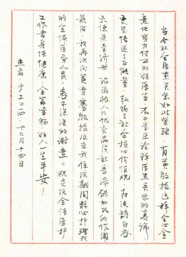 1591日前,我院院办收到了喜好书法的任女士送来的感谢信一封,表达了对医院医护人员的感谢,特别感谢妇科大主任黄章骞主任医师在其门诊的仔细诊疗和住院期间的悉心照顾。任女士在表扬信里说道,当今社会医患关系如此紧张,有黄教授这样全心全意地付出的好医生,不正是在诠释着医患关系的真谛、更是传递了正能量、弘扬了社会主义核心价值观。尤其黄教授待病人如亲人,医术精湛,态度和蔼,拒收红包,值得表扬,饱含感激的肺腑之言,表达...