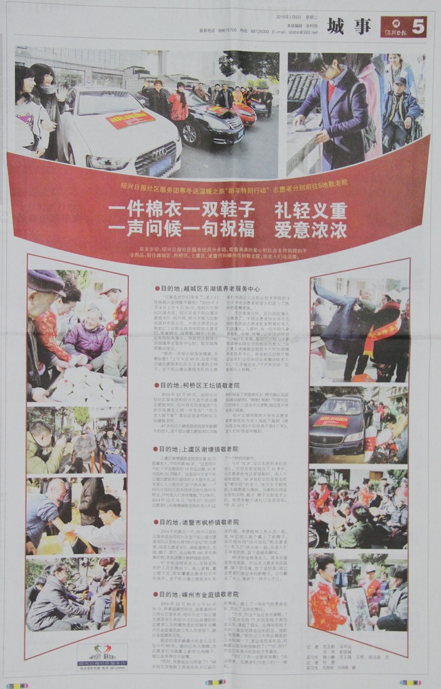 1510目的地:嵊州市金庭镇敬老院2014年12月29日上午10点30分,伴着温暖的阳光,搭载着绍兴日报社区服务团、绍兴市老干部公德志愿服务队和绍兴市妇幼保健院的志愿者以及捐赠物资的两辆车在嵊州市金庭镇民政工作人员带领下,驶往金庭镇敬老院。敬老院里年龄最大的老人王玉仙今年89岁,意识已有点模糊,当志愿者们为她戴上新的毛线帽子,她还是笑得合不拢嘴。“哎呀,我都能去当明星了!”68岁的王存根脱下原来那件早已破...