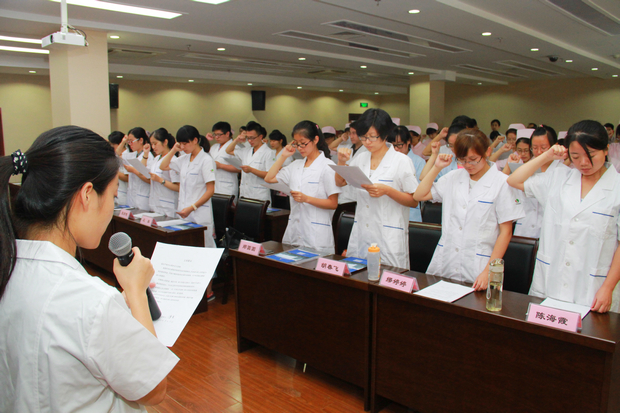 17298月15日下午,我院举行2014年新职工上岗仪式。何炳福院长、张建荣书记、徐关德、方敏、陈小明副院长及各科室负责人、52余名新职工参加。在欢快的音乐声中,张建荣书记宣读了关于表彰优秀学员的通知,对岗前培训期间表现突出的陈海霞等12名新职工予以表彰。医院领导班子为12名优秀学员颁发荣誉证书,并为全体新职工授工作服。在2014年新职工代表谭晨的带领下,大家举起右手许下铮铮誓言:“我愿终身从...